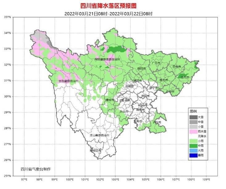 21日白天到晚上,盆地各市陰天間多云,廣元、綿陽、德陽、巴中、達州、南充、廣安、瀘州、雅安9市和成都西部、樂山南部有小雨,其中達州局部有中雨;阿壩州和甘孜州北部、涼山州東北部多云間陰有陣雨(雪),局地中雨(雪),甘孜州南部和攀西其余地方多云見晴。