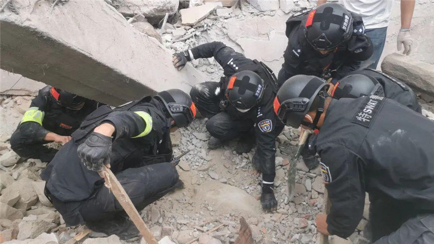 14時20分,翻山越嶺奔襲的240名甘孜特警抵達(dá)磨西鎮(zhèn)?!熬驮谶@兒!”“就在這兒!”15時左右,幾名特警來到海螺溝一處大型搜救設(shè)備無法進(jìn)入的區(qū)域,為避免鐵鍬傷人,硬是徒手刨土,從斷壁殘垣間救出一名被困群眾,緊急送往醫(yī)院搶救。