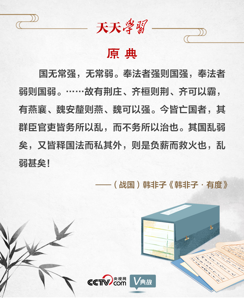 韓非子是戰(zhàn)國時期法家思想的集大成者?!坝卸取?,就是有法度。韓非子把“奉法”作為治亂興亡的關(guān)鍵,提出“國無常強,無常弱。奉法者強則國強,奉法者弱則國弱”。意思是,國家不會永遠富強,亦不會長久貧弱。執(zhí)行法度的人堅決,國家就會富強;執(zhí)行法度的人軟弱,國家就會貧弱。