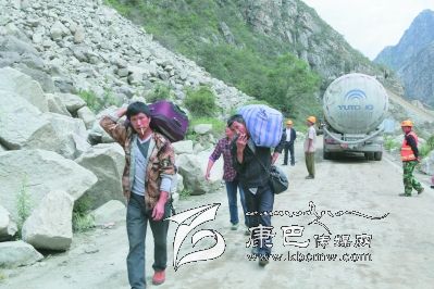 交通中斷后,過往人員只有步行通過受災路段。