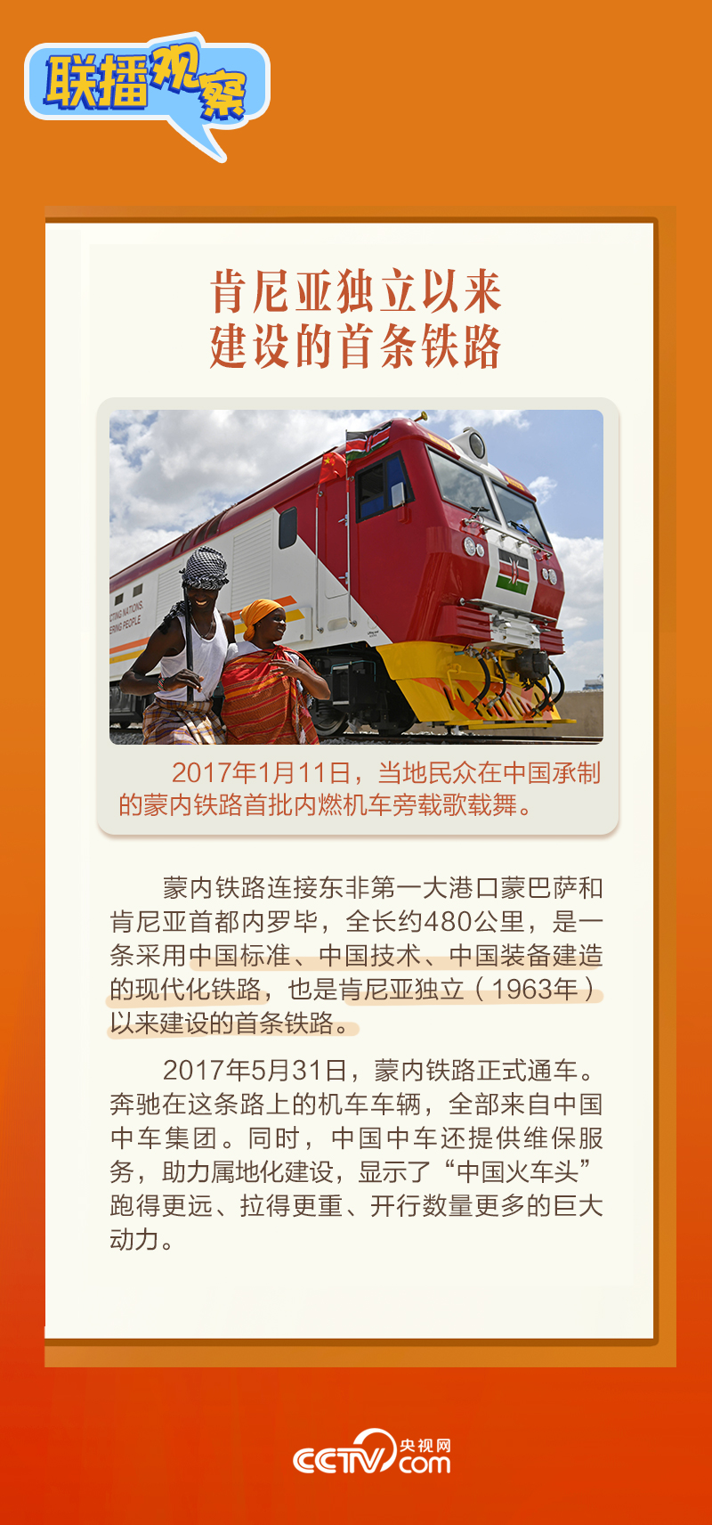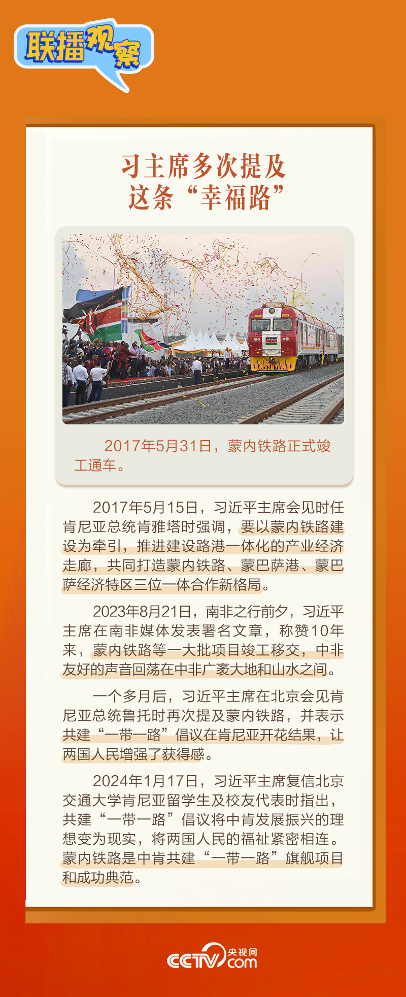 此前,習(xí)主席在外事活動(dòng)中多次提及蒙內(nèi)鐵路,《新聞聯(lián)播》也持續(xù)關(guān)注這條路的建設(shè)及開(kāi)通后的運(yùn)營(yíng)情況。這條“幸福路”有何特別之處,習(xí)主席為何頻頻提及?它的建成通車(chē)給當(dāng)?shù)貛?lái)哪些變化?《聯(lián)播觀察》邀您一同了解。
