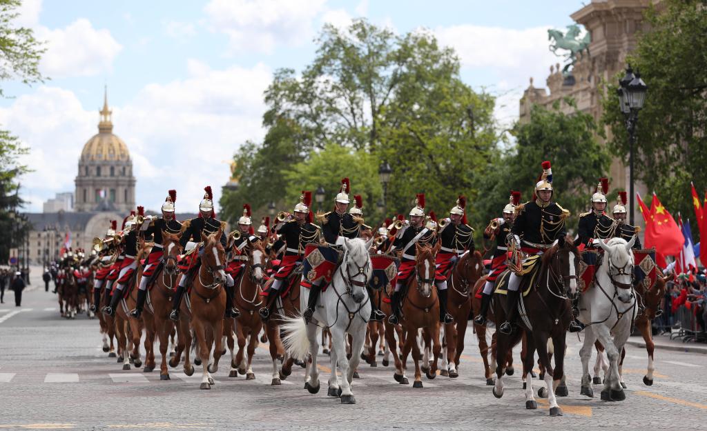 ??當(dāng)天下午,習(xí)近平在巴黎出席馬克龍舉行的隆重盛大歡迎儀式。兩國(guó)元首檢閱法蘭西共和國(guó)衛(wèi)隊(duì)和陸??杖妰x仗隊(duì),并觀看分列式。