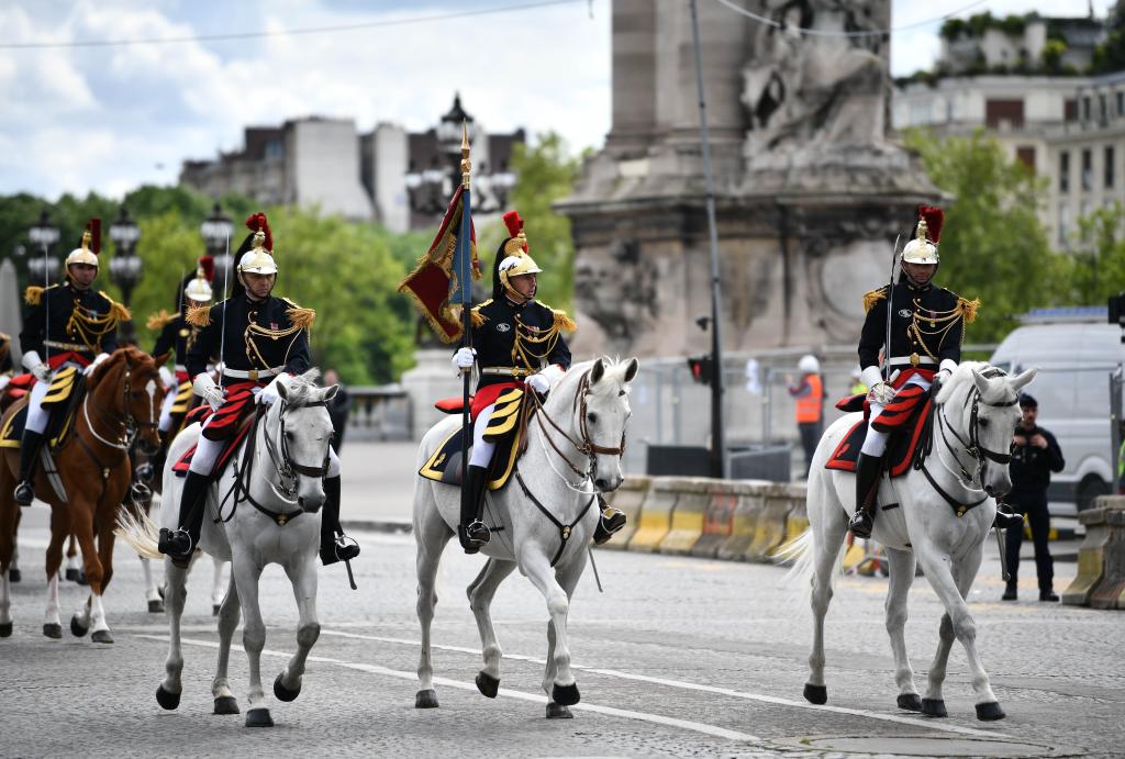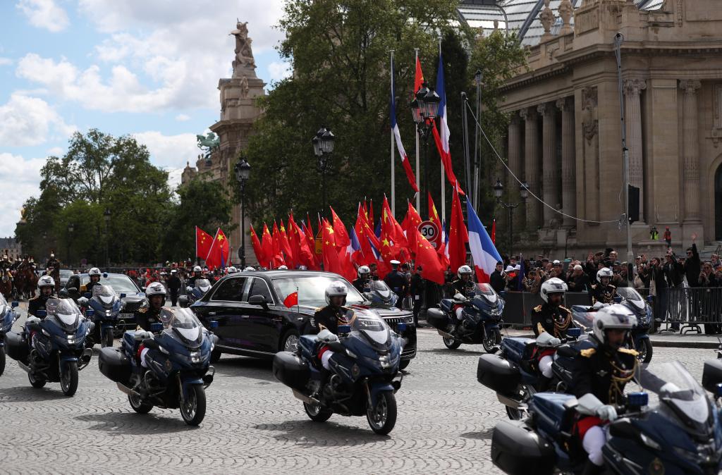 ??歡迎儀式后,習(xí)近平和夫人彭麗媛在共和國(guó)衛(wèi)隊(duì)148名騎兵組成的禮兵馬隊(duì)和摩托車隊(duì)護(hù)衛(wèi)下,乘車前往愛(ài)麗舍宮。