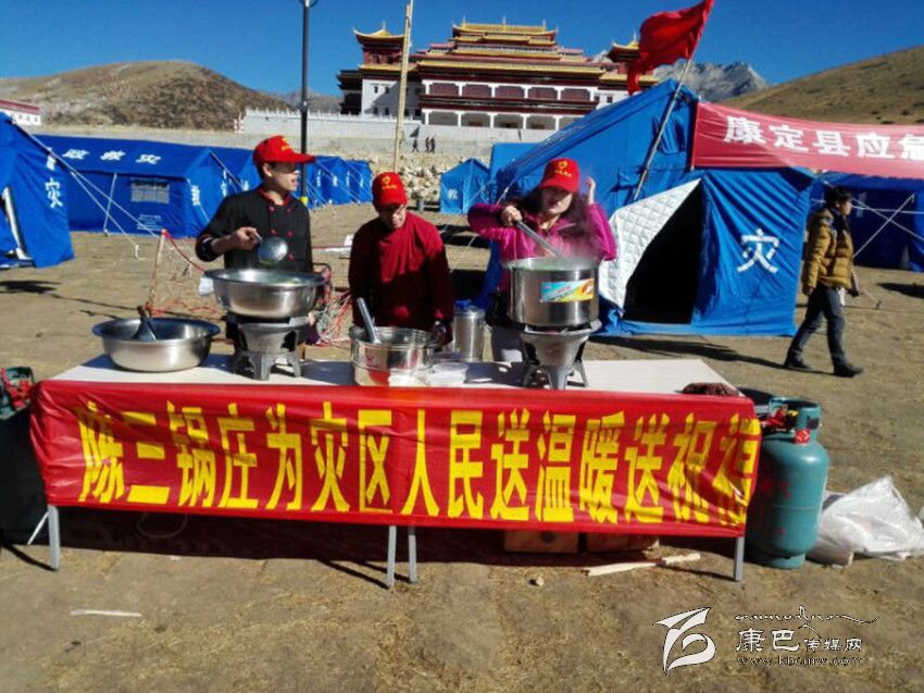 11月28日中午,記者來到康定塔公鎮(zhèn)祖慶小學(xué)采訪。在現(xiàn)場,一群戴著紅帽子的人正在將熱氣騰騰的紅燒肉一勺一勺的分發(fā)到同學(xué)們碗中。仔細(xì)一看,現(xiàn)場還有一幅標(biāo)語,上面寫著“陳三鍋莊為災(zāi)區(qū)人民送溫暖送祝福”的字樣。記者揉了揉眼,確定沒看錯。原來,陳三鍋莊是關(guān)了康定的門店,組織人員到災(zāi)區(qū)參與抗震救災(zāi)來了。