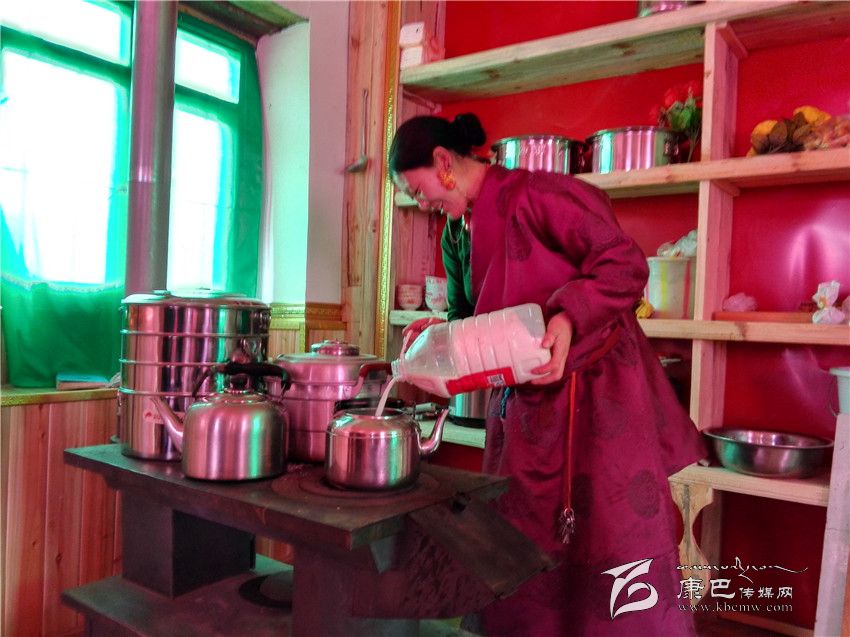 走進(jìn)江巴達(dá)吉的家里,一股熱浪撲面而來,小鋼爐上燒著熱水,幾個(gè)女人正在備料準(zhǔn)備包酥油包子和牛肉餃子。藏桌上擺滿了糖果、牛肉,豐盛的食物琳瑯滿目。江巴達(dá)吉愜意地喝著奶子茶,知足和幸福寫在臉上。