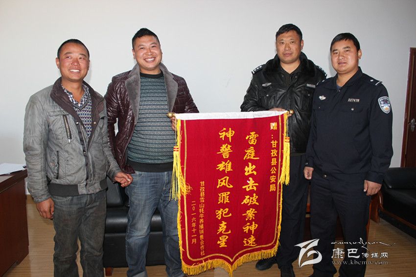 本網(wǎng)訊(余應(yīng)瓊 文/圖)11月11日,甘孜縣雪山牦牛養(yǎng)殖銷售合作社負(fù)責(zé)人鄭萬強(qiáng)將一面繡有“雷霆出擊破案神速 神警雄風(fēng)罪犯克星”的錦旗送到縣公安局,表達(dá)對公安干警迅速破案,幫助貧困群眾挽回經(jīng)濟(jì)損失的感激之情。