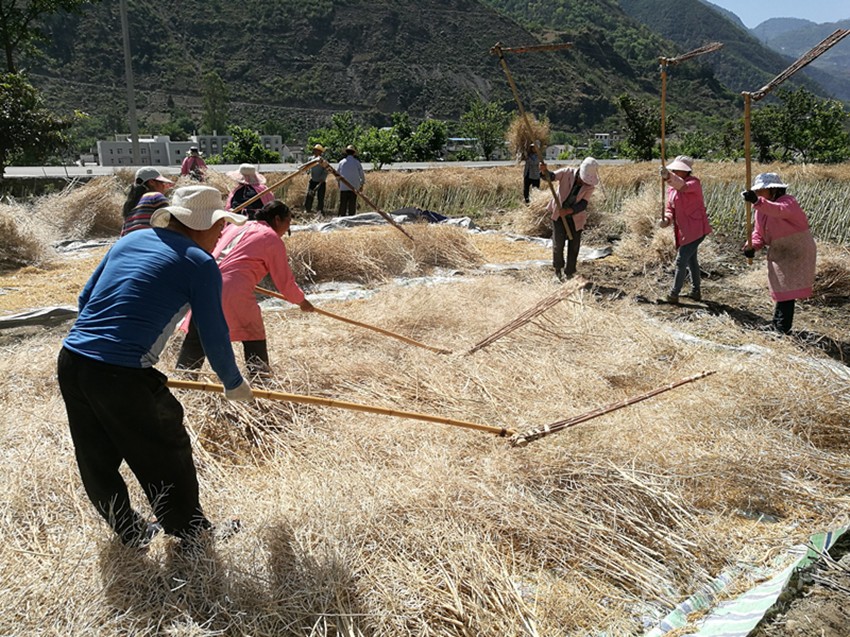 本網(wǎng)訊(尼胡克布 李娟 文/圖)5月12日,在瀘定縣德威鄉(xiāng)下河壩村農(nóng)田里,村民李永強(qiáng)正組織親戚朋友20余人,對(duì)自家3畝多油菜進(jìn)行搶收。村民們有的負(fù)責(zé)把一捆捆曬干的油菜抱到油布上,有的負(fù)責(zé)用農(nóng)具進(jìn)行打籽,現(xiàn)場(chǎng)一派繁忙的景象。