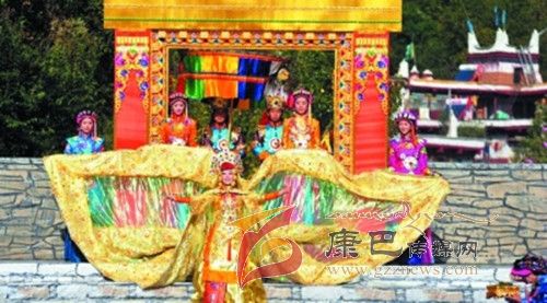 在催人奮進的戰(zhàn)鼓聲中,一群身披甲胄的士兵拿著長劍,背著巨弓走到臺前,在鏗鏘的戰(zhàn)鼓聲中,戰(zhàn)士們做著各種競技動作,模仿武士們互相攻擊的樣子,那矯健的身影展示了遠古時代嘉絨藏族先民們?yōu)榱松媾c自然努力抗爭的場景。過了一會兒音樂一轉,戰(zhàn)鼓聲漸漸減弱,在鳥雀的陣陣啾啾聲中,一座木門慢慢的開啟,一位身披長袍、頭戴鳳冠的女王在眾多美女的簇擁下,緩緩走下臺階步入舞臺中央,此時,一位手捧托盤的老者來到女王面前單膝下跪,將托盤高舉過頂,并邀請女王品嘗佳肴,女王將中指在酒中蘸了蘸,并曲起中指向四周輕輕彈去,寓意愿將杯中美酒與四方百姓同飲。在女王面前還放置著一個凈水桶,桶中盛滿了清澈的甘泉,桶上橫放著一枝柏樹枝,女王伸出纖纖玉手,拿著柏樹枝在水中蘸了蘸,面向墨爾多神山撒去,寓意向神山祈福。這是此次《美人谷·丹巴》節(jié)目展演中的序曲部分,有著強烈的東女神韻,將遠古時代東女國女王遺風展演的淋漓盡致。