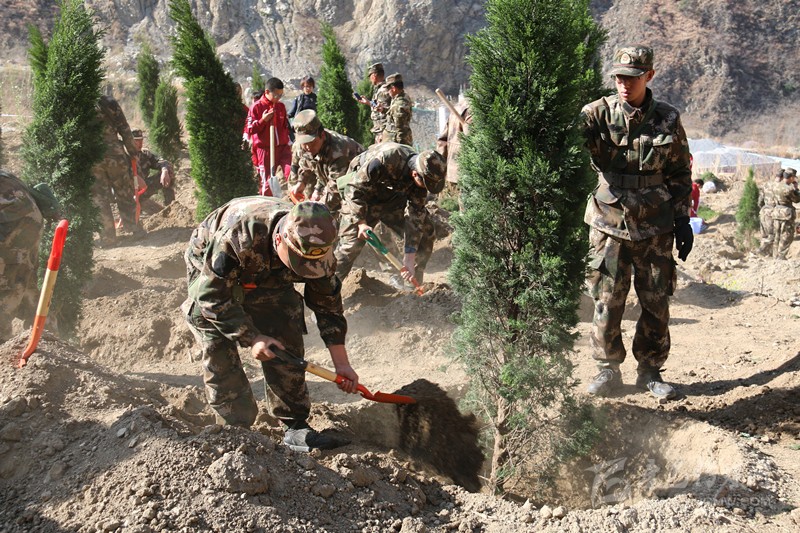 官兵們正在填土。