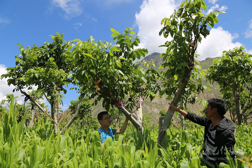 技術(shù)人員正在核桃基地檢查核桃嫁接情況。