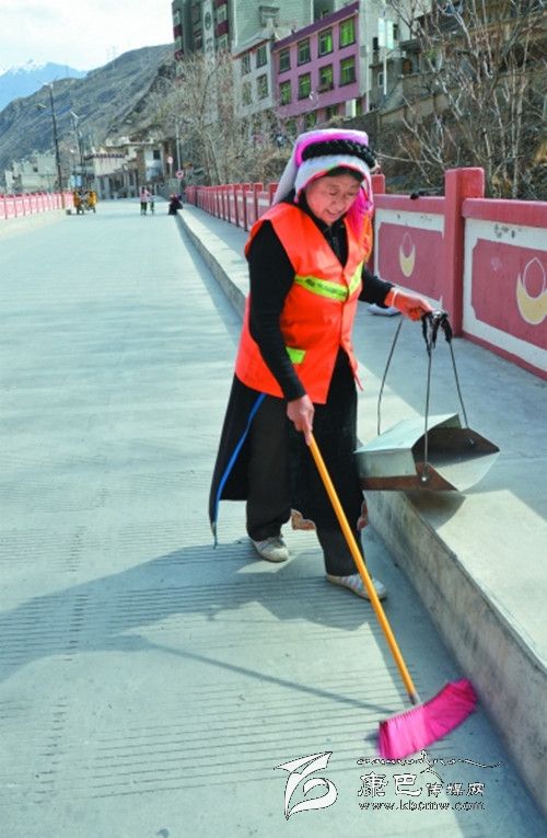 由于丹巴縣城素有風(fēng)城之稱,五條山谷的風(fēng)仿佛都聚集在了志瑪大姐負(fù)責(zé)的濱河路上,風(fēng)的匯聚也成了垃圾的集中點(diǎn),當(dāng)時(shí)在分配工區(qū)時(shí),許多清潔工都唯恐這段路落在自己頭上,可志瑪大姐卻主動(dòng)承擔(dān)起這段路面的清潔任務(wù),每天其他清潔工人還在睡夢(mèng)中時(shí),她就早早的起床,開始一天的工作。烈日當(dāng)空時(shí),別人都躲在家里乘涼時(shí),志瑪大姐還在路段上來回的巡視,時(shí)刻保持路面的清潔。冬日來臨寒風(fēng)呼嘯,城市里的人們都蜷縮在蝸居里開著空調(diào)、電暖氣等,享受著天倫之樂時(shí),志瑪大姐卻穿著厚厚的冬裝,戴著手套在濱河路上費(fèi)力的掃著地,她從來沒有叫過一聲苦,有人勸她放棄這段路,她總是笑著說:“國家給了我工資,我就要好好的干,再說城市如果沒有我們這些清潔工,那市民將會(huì)生活在臟亂差的環(huán)境里,將有損丹巴這座美麗小城鎮(zhèn)的形象。”