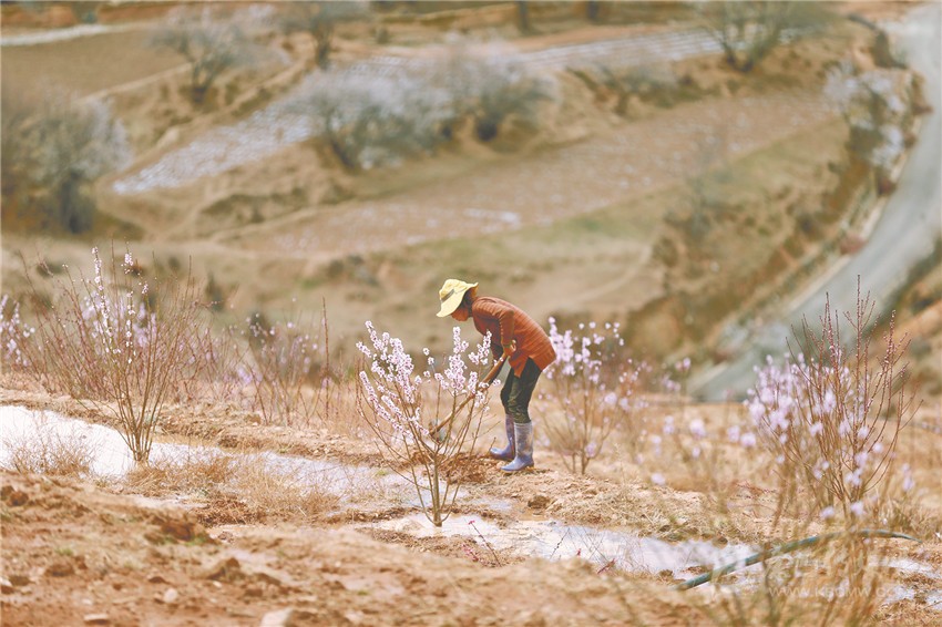 “情緣桃林”四個(gè)大字鑲嵌在半山腰,成片的桃林井然有序地排列在3000畝土地上,猶如沙場(chǎng)點(diǎn)兵,十分壯觀。
