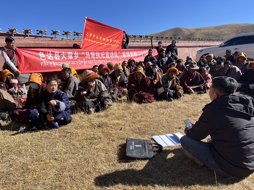 “針對(duì)色達(dá)高寒偏遠(yuǎn)、地廣人稀,牧區(qū)群眾生活居住較分散的情況,我們調(diào)配縣鄉(xiāng)村三級(jí)紀(jì)檢監(jiān)察力量,逐步組建起精通藏漢雙語、熟悉紀(jì)法知識(shí)、擅長(zhǎng)群眾工作的馬背執(zhí)紀(jì)宣講隊(duì),把黨的聲音傳遞到云端藏寨、天邊牧場(chǎng)?!鄙_(dá)縣紀(jì)委書記、監(jiān)委主任陳玉龍介紹,黨的二十大以來,宣講隊(duì)已開展宣講活動(dòng)20余場(chǎng)次,推動(dòng)為群眾辦實(shí)事10余件,解決困難訴求20件。