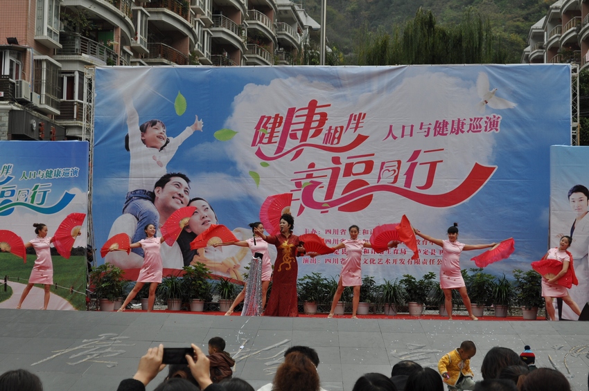舞臺(tái)上“健康相伴•幸福同行”大型演出背景格外醒目,由省虹宇藝術(shù)團(tuán)自編自演的舞蹈《歌舞青春》、金錢板《怪哪個(gè)》、小品《你生不生》、四川清音《分級(jí)診療就是好》、雜技《烏依人》、戲曲《天府奇葩》等節(jié)目陸續(xù)登場(chǎng)。演員們通過(guò)戲曲、歌曲等形式,向廣大觀眾傳播衛(wèi)生計(jì)生新政策,臺(tái)下各縣屬醫(yī)療衛(wèi)生計(jì)生機(jī)構(gòu)醫(yī)務(wù)人員免費(fèi)開(kāi)展義診活動(dòng),為廣大群眾查血壓、詢問(wèn)病史、咨詢等忙個(gè)不停,群眾與演員互動(dòng)場(chǎng)面感人。演出活動(dòng)取得良好的教育效果,得到廣大群眾的熱烈歡迎。