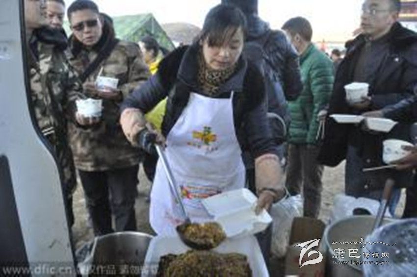 據(jù)了解,韓大哥是這家飯店的老板之一,他是仁壽縣人,幾年前和朋友來到新都橋開始經(jīng)營飯店??刀?.3級地震發(fā)生時,他人在成都。但看到災情發(fā)生,韓大哥立即和飯店另外幾個合伙人決定到安置點免費送盒飯,“我在當?shù)刈隽?、7年生意,現(xiàn)在出了事情,就應該伸手支援嘛!”據(jù)韓大哥介紹,此次地震發(fā)生后,新都橋80%左右的飯店都已經(jīng)關(guān)門,他們的飯店因為還有一些接待工作,仍在正常營業(yè)。自11月23日晚上,他家的飯店就主動為塔公鎮(zhèn)的安置點免費派送盒飯,“包括中午和晚上兩頓,兩葷兩素一湯的配置。”因為太忙, 韓大哥來不及仔細統(tǒng)計,他大概知道每天送出的盒飯在1200盒到1500盒之間,每天送出盒飯的成本在4、5千左右。但在他看來,這些其實都算不上什么,“能為災區(qū)出一份力,我們就很滿足了,我們打算一直送到抗震救災工作結(jié)束,也就是直到災民有條件自己做飯的時候。”“這邊天氣很冷,他們吃的一般是些面包、牛奶之類的干糧,我們就是想讓大家吃到熱飯、熱菜。”據(jù)韓大哥介紹,每天飯店都會派出3、4個人將盒飯運送到安置點,“只要有人需要我們都會分發(fā)盒飯,包括一些志愿者和武警官兵也吃我們的飯。