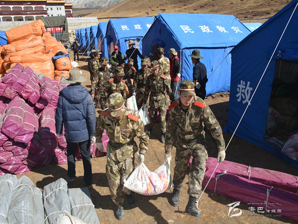 森警官兵在抗震救災(zāi)中搬運生活物資。