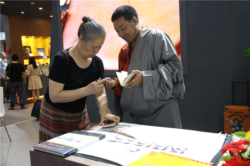 而在同一地點的另一側,省級藏文書法傳承人巴松鄧珠的藏文書法也吸引著眾多愛好書法市民前來觀賞,還有的與他合影。“指導過我的書法家非常多,他們不僅給了我許多寶貴的意見,更重要的是給了我信心和動力,讓我堅持寫書法,并成為康體藏文書法的傳承人?!卑退舌囍檎f,這次能夠得到州委、州政府搭建的平臺,我會珍惜好這次難得的機遇,把作品展示好、宣傳好,讓全國各地的人們更多地了解我州民族文化。