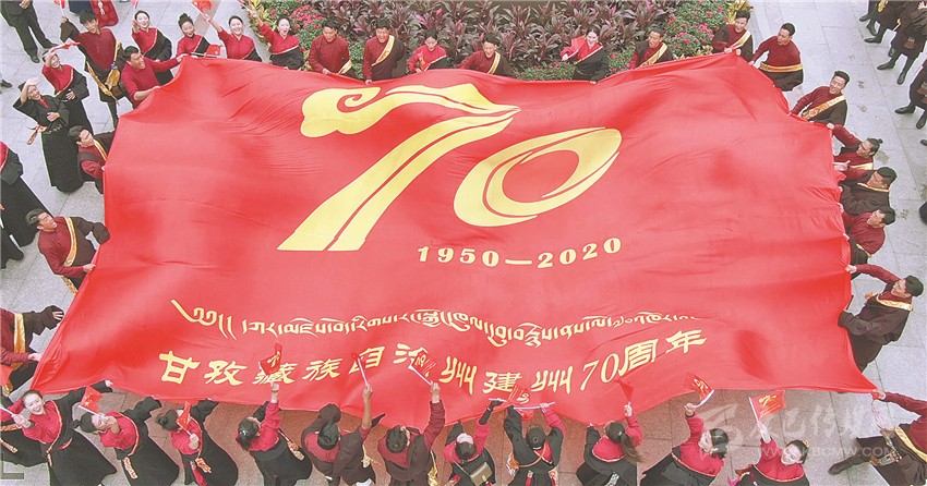 美妙的歌聲縈繞四方,鮮艷的旗幟迎風(fēng)飄揚(yáng)。就在眾人忘情高歌之時(shí),來(lái)自州歌舞團(tuán)的50多名演員將一面巨大的印有“建州70年Logo”的紅旗,在廣場(chǎng)正中鋪展開(kāi)來(lái)。以這面旗幟為中心,先后到來(lái)的人們組成了三個(gè)同心圓,用歌聲禮贊甘孜州建州70周年。