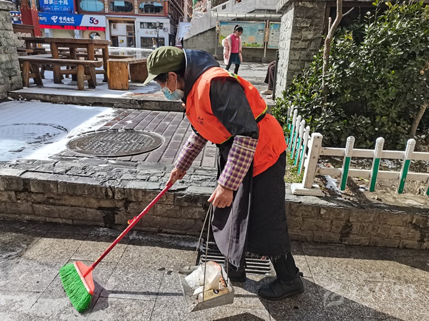 1月30日,農(nóng)歷大年廿九,在康定市的街道,環(huán)衛(wèi)工人宋光芳已穿好工作服,拿著掃帚和撮箕,仔細(xì)地清掃路面。自2012年,宋光芳從事環(huán)衛(wèi)工作,到現(xiàn)在已經(jīng)10個(gè)年頭了,在這10年里,她每天早出晚歸,耕耘在環(huán)衛(wèi)工作第一線。為了給市民營造干凈、舒適的節(jié)日環(huán)境,今年春節(jié)她仍和往年一樣堅(jiān)守在工作崗位上,保證城市干凈衛(wèi)生的環(huán)境。