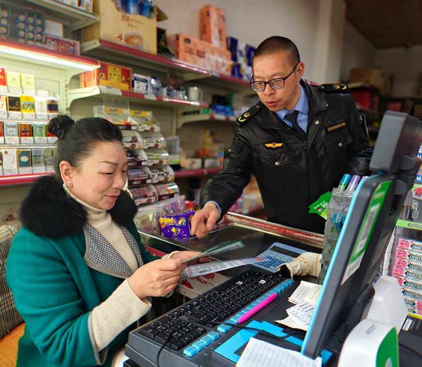 圖為工作人員向商戶發(fā)放宣傳資料。