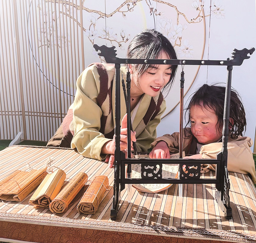 卓妍雅教孩子寫(xiě)書(shū)法。