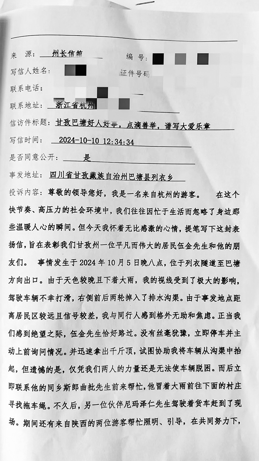 一封感謝信,從杭州的網(wǎng)端出發(fā),抵達“州長信箱”,再轉(zhuǎn)送到巴塘,跨越千里,情意綿長,引出一段感人至深的好人好事?!白鹁吹念I(lǐng)導您好,我是一名來自杭州的游客。今天我懷著無比感激的心情,提筆寫下這封表揚信,旨在表彰我們甘孜州一位平凡而偉大的居民伍金先生和他的朋友們……”