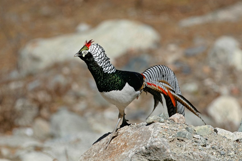 白腹錦雞(學(xué)名:Chrysolophus amherstiae):藏語譯音:甲嚇破呷妞仁 別名:銅雞、寬寬雞 國(guó)家II級(jí)保護(hù)動(dòng)物,見于瀘定、康定、丹巴、九龍等。 雄鳥全長(zhǎng)約140厘米,雌鳥約60厘米。雄鳥頭頂、背、胸為金屬翠綠色;羽冠紫紅色;后頸披肩羽白色,具黑色羽緣;下背棕色,腰轉(zhuǎn)朱紅色。飛羽暗褐色。尾羽長(zhǎng),有黑白相間的云狀斑紋。腹部白色。嘴和腳藍(lán)灰色。雌鳥上體及尾大部棕?