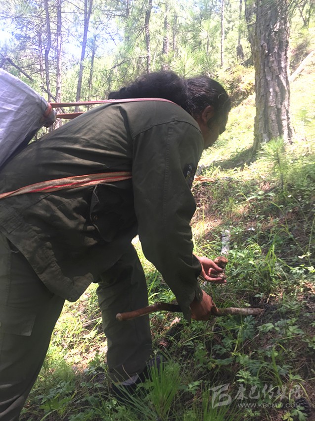 披著夜色,記者和康扒珠徑直向基俄山頂走去,要找到最好的松茸,就要走最遠的路。約莫走了近一個半小時的路,記者和他已經(jīng)來到基俄山的半山腰,康扒珠貓著腰尋找起來。第一次參與采摘松茸的記者十分興奮。很快康扒珠已經(jīng)發(fā)現(xiàn)了第一朵松茸??蛋侵橛檬种械哪竟鬏p輕地將松茸挑起來,握在手中仔細打量,他告訴記者:“這顆松茸個頭挺大,但是還不是精品,開傘了,只能算是三等品?!闭f罷他又繼續(xù)尋找松茸。過了一個多小時,他的背簍里也才有十幾朵松茸。