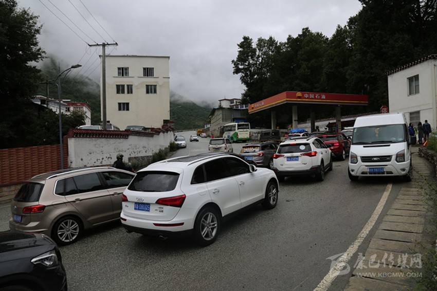 8月7日上午9時10分,中石油康定市折多山加油站,左側加油進車口排起了長龍,記者目測,在加油站進口處,等待加油的車輛已排成三排,約有六七十米遠,當時等待加油的車輛有43輛。排隊車輛占據(jù)了國道318線此路段一半路面,從折多山方向駛來的車輛很多,有部分車輛沒料到此路段有車輛占道,急忙放緩車速。