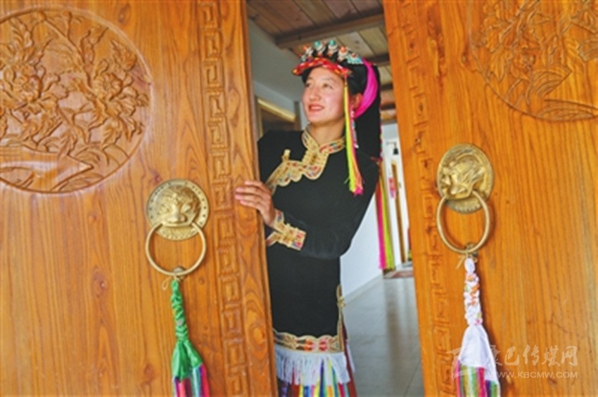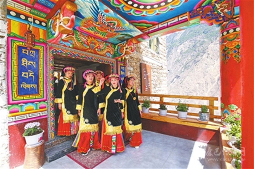 步入藏寨,藏式花紋的窗欞外懸掛著火紅的辣椒和金黃的玉米。朱紅色的大門上刻著藏式圖騰,客廳里色彩鮮艷、雕龍畫鳳的藏式餐桌上則擺滿了當(dāng)?shù)厥a(chǎn)的時令瓜果。室內(nèi)房間干凈整潔,有寬大的床鋪、客廳和洗手間,手捧香甜的酥油茶,倚窗而立,樹葉隨風(fēng)擺動,似乎在訴說著少女心中對外面世界的向往。