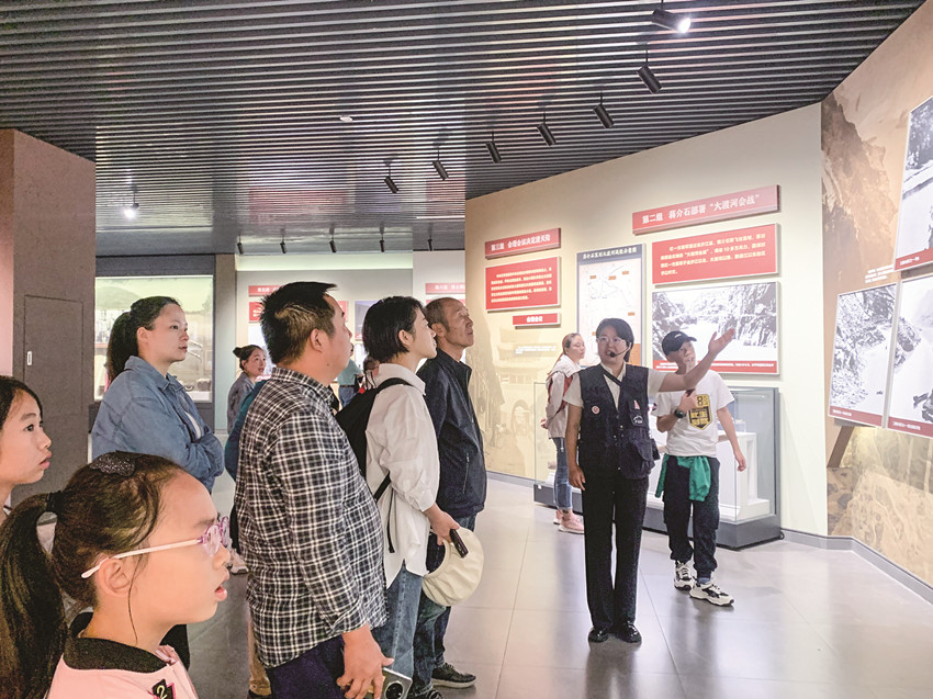 “國慶節(jié)的心情若有顏色,一定是紅色。瀘定作為一座紅色之城,擁有數(shù)不勝數(shù)的珍貴‘紅色寶藏’,這里有無數(shù)的紅色故事可以講述,也有光榮的革命精神在悠久傳承?!闭跒o定橋東橋頭排隊(duì)檢票的重慶游客李先生表示,他們一家?guī)е谏闲W(xué)六年級的兒子利用“雙節(jié)”假期,到瀘定體驗(yàn)“紅色文化研學(xué)”線路,從書本到現(xiàn)實(shí),走上瀘定橋接受紅色教育,感受長征精神。
