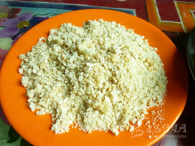 奶渣是奶提煉酥油后剩下的物質(zhì),經(jīng)燒煮,水份蒸發(fā)后,剩下是奶渣,奶渣可以做成奶餅、奶塊。在煮牛奶過程中,還可揭起奶皮,藏語叫“比瑪”。奶皮就像豆腐皮一樣,好吃又富有營(yíng)養(yǎng)。奶品是藏族的重要食品,家居或外出,人們都帶上它。在零食品種不多的藏區(qū),大人們常把奶渣給小孩當(dāng)零食。麻森在盤子里放上適量的糌粑、酥油、碎奶渣及碎紅糖,攪混揉合,盛入一方形小木盒內(nèi),用手塞滿、壓實(shí),即可制成麻森方形糕,其味香甜可口。