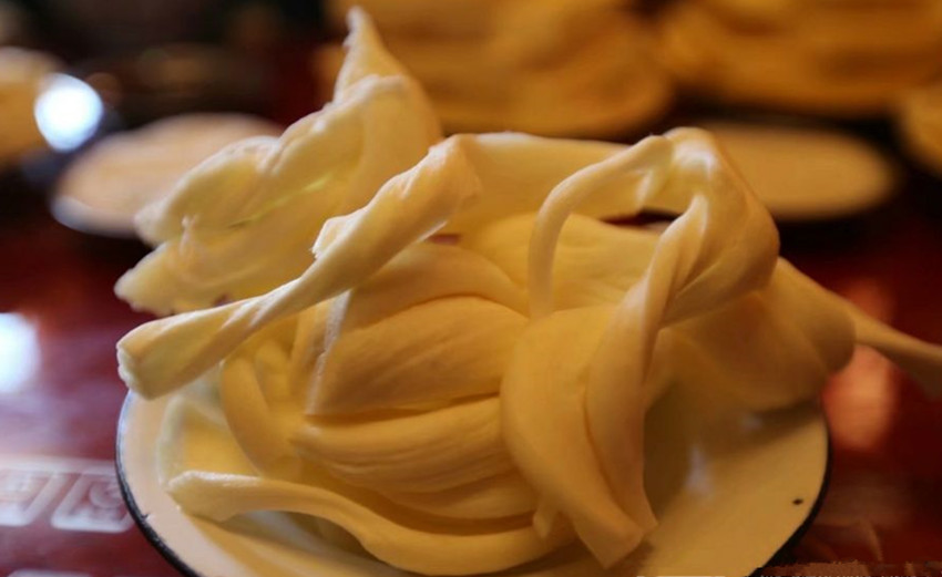 酥油古稱醍醐,元代才開始叫酥油。元代宮廷食醫(yī)思慧在《飲膳正要》中記述了酥油的提取方法:“取凈奶子,不住手用阿赤打,取浮油者為思馬哥油,今亦云曰酥油。”文中“阿赤”是提取酥油的木器。提取酥油有專門的酥油桶,桶里有一個連桿木柄,倒上牛奶,蓋上桶蓋后,連續(xù)上下抽動連桿木柄數(shù)百上千次,黃澄澄的酥油塊就全部浮在上面了。把酥油塊用手捏成坨,擠去水份,丟進(jìn)清水里泡一會兒,就可以食用了?,F(xiàn)在牧區(qū)打酥油普遍用奶油分離器,既快又省。