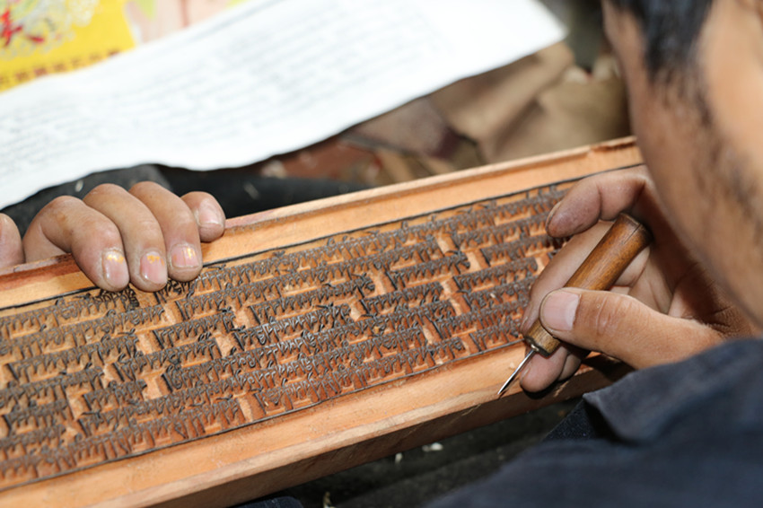 彭措澤仁現(xiàn)在的主要工作是核對、修復(fù),幾千塊有破損、錯(cuò)字或被老鼠咬壞的印版,經(jīng)他手得以復(fù)原。每完成一塊,彭措澤仁都會雙手將印版高舉過頭,閉目許愿。這是“敬畏之心”。